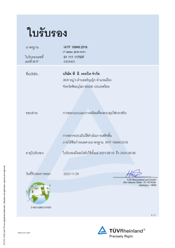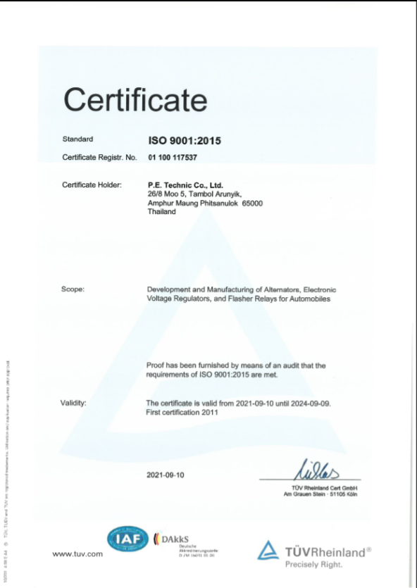 P.E.Technique Co., Ltd. was established in 1985 as a manufacturer of automotive parts such as alternators, cutouts, fresheners and relays under the brand name REC. In 2004, the company was certified with ISO 9001 quality standards and in 2009, the company was certified with IATF 16949 quality standards , which are accepted worldwide. The company has both domestic and international customers, focusing on Aftermarket, OES/OEM and ASEAN customers such as Malaysia, Singapore, Cambodia, Vietnam, Indonesia, Myanmar, Laos, and also exports to Europe, the Middle East and Africa. Our products are continuously developed to provide quality products for customers. We have over 30 years of manufacturing expertise and have a R&D department to conduct research and develop products that are strong and durable and have protection against damage, making our products suitable for heavier than normal use and supporting use in abnormal conditions, making our products widely accepted by customers for a long time.